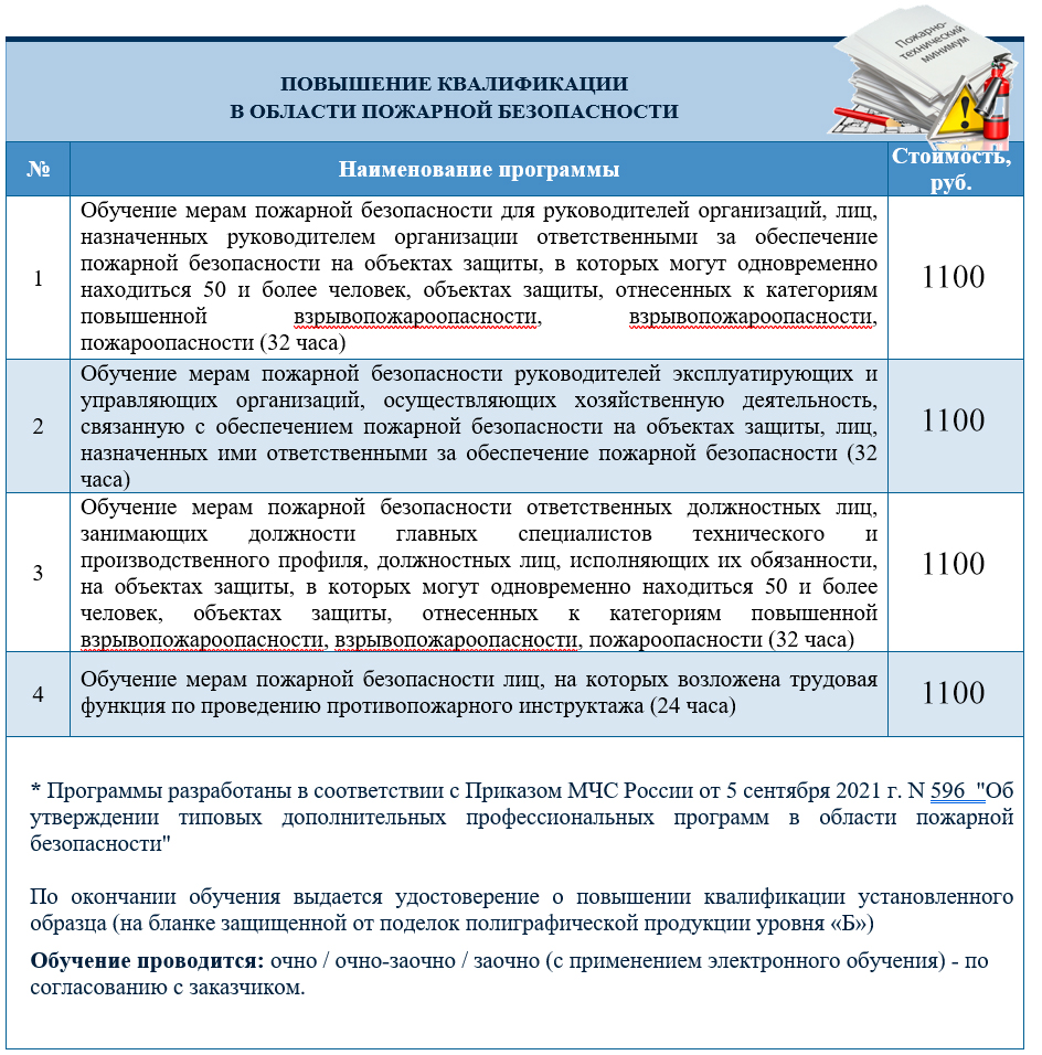 С 1 марта 2022 года вступили в силу новые правила и программы обучения мерам пожарной безопасности работников. Работникам, ответственным за пожарную безопасность, а также специалистам, проводящим инструктажи, необходимо получить дополнительное образование либо переобучиться (пройти обучение теперь можно дистанционно):