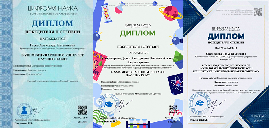 - VIII Международный конкурс научных работ. ЦИФРОВА НАУКА. Диплом II степени – Гусев Александр Евгеньевич.