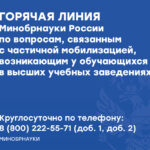 Открыта «горячая линия» Минобрнауки России по вопросам, связанным с частичной мобилизацией, возникающим у обучающихся в высших учебных заведениях.