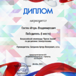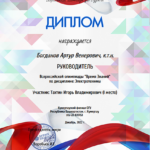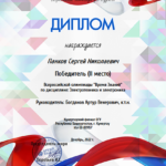 2 декабря 2022 г. обучающиеся 4 курса направления подготовки «Электроэнергетика и электротехника» Панков Сергей и Тахтин Игорь под руководством доцента кафедры ЭПП Богданова А.В. приняли участие в онлайн-олимпиаде на сайте международных и всероссийских конкурсов для педагогов, студентов, воспитателей и детей «Время знаний» по двум дисциплинам «Электротехника» и «Электротехника и электроника».