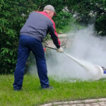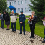 Далее работникам и обучающимся был продемонстрирован порядок действий при использовании огнетушителя для тушения очага возгорания и рассказаны правила использования самоспасателя — устройства для защиты органов дыхания от опасных факторов пожара.