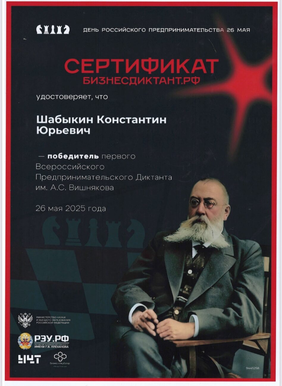 26 мая 2025 года, в День российского предпринимательства, состоялся первый Всероссийский предпринимательский диктант им. А. С. Вишнякова, организатор которого стал Российский экономический университет имени Г.В. Плеханова.