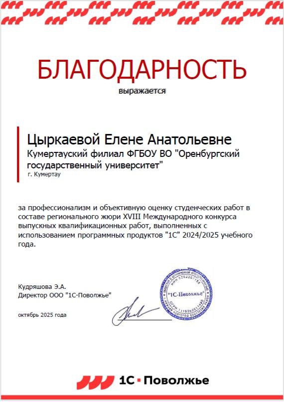 Руководитель ООО «1С Поволжье» выразил благодарность Елене Анатольевне за профессионализм и объективную оценку студенческих работ.