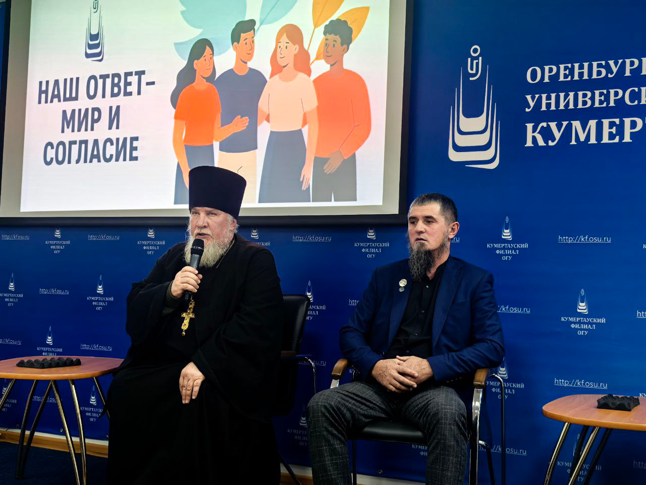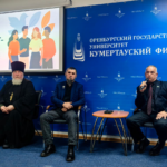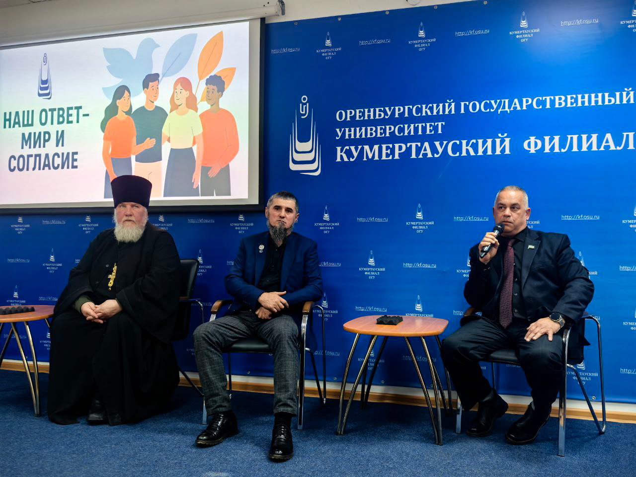 Под таким названием 29 октября прошла встреча в формате «Диалога на равных» для студентов Кумертауского филиала ОГУ, посвященная теме профилактики противодействия терроризма и экстремизма в молодежной среде, толерантного отношения к людям различного вероисповедания и антитеррористической направленности. Мероприятие было организовано отделом социально-воспитательной работы Кумертауского филиала ОГУ совместно с представителями духовенства Благочинного городского округа г. Кумертау и Куюргазинского района протоирея Сергея Ветрова, помощника Мухтасиба Куюргазинского района и города Кумертау при Духовном управлении мусульман Республики Башкортостан — Фаниса Хазрата, и руководителя региональной общественной организации Кумертауского филиала Морского собрания Республики Башкортостан Амира Биктимирова.