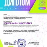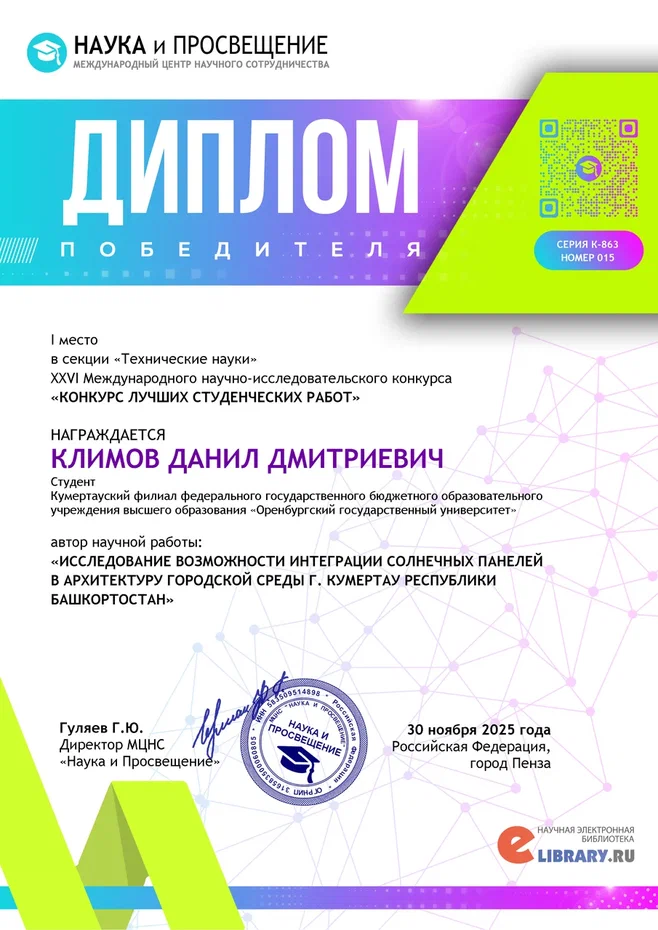 Данил представил исследование на тему «Исследование возможности интеграции солнечных панелей в архитектуру городской среды г. Кумертау Республики Башкортостан» в секции «Технические науки» и по итогам конкурсных слушаний занял 1 место.