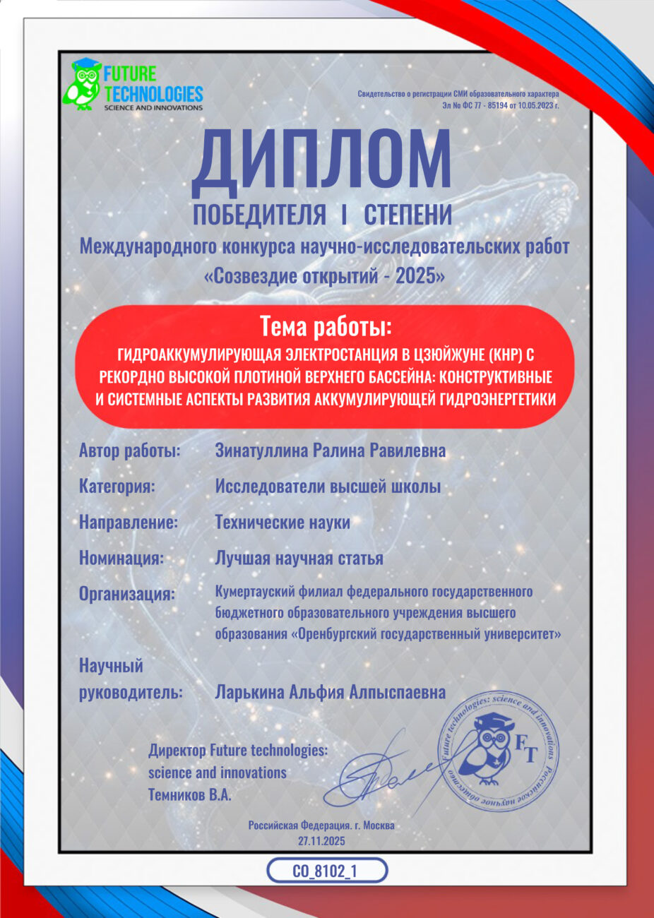 Тема её исследования — «Гидроаккумулирующая электростанция в Цзюйжуне (КНР) с рекордно высокой плотиной верхнего бассейна: конструктивные и системные аспекты развития аккумулирующей гидроэнергетики». В своей работе Ралина провела глубокий инженерно-технический анализ одной из самых масштабных и технологически сложных ГАЭС в мире, уделив внимание уникальным конструктивным решениям, вызовам строительства и роли подобных объектов в энергосистемах будущего.