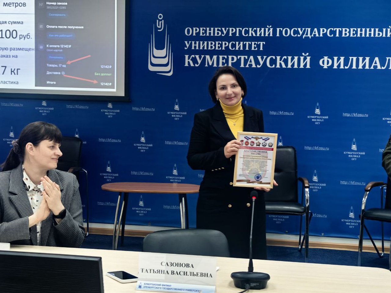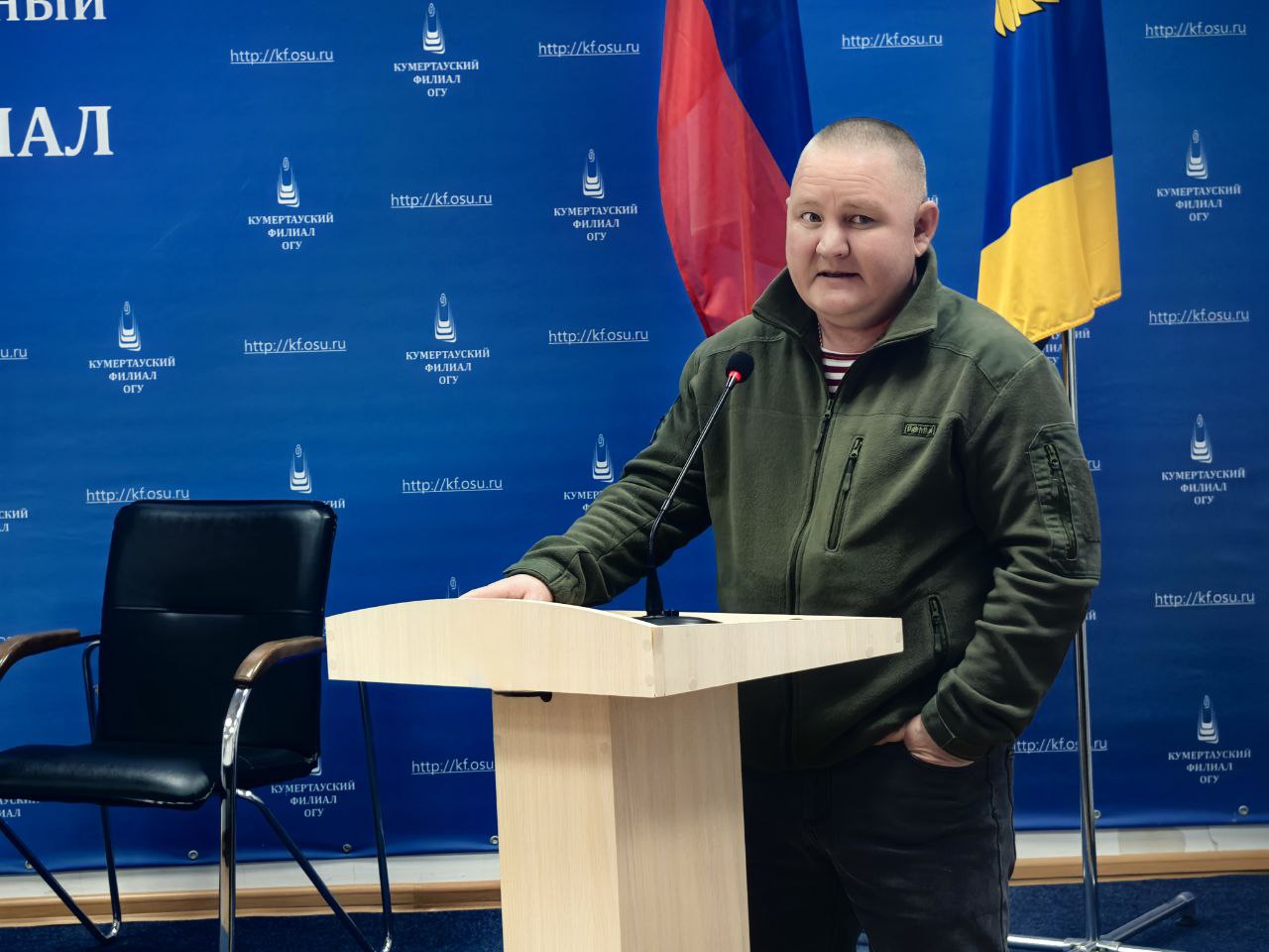 Также, выразить слова глубокой благодарности за оказанную помощь всему коллективу и лично директору Кумертауского филиала ОГУ Татьяне Сазоновой приехал участник боевых действий в ЦАР, Сирии, ветеран СВО, волонтер, занимающийся организацией, сбором и доставкой гуманитарной помощи непосредственно в зону проведения СВО – Артур Шаяхметов.