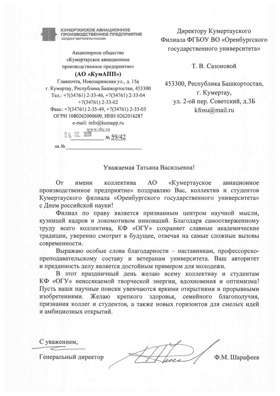 От имени коллектива АО «Кумертауское авиационное производственное предприятие» поздравляю Вас, коллектив и студентов Кумертауского филиала
