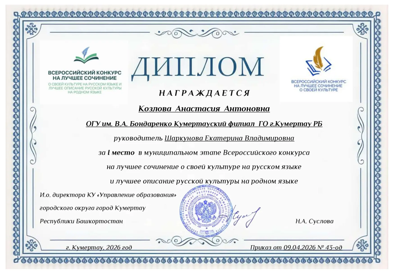 В интеллектуальной и творческой жизни Кумертауского филиала ОГУ имени В. А. Бондаренко произошло знаменательное событие. Студентка первого курса группы 25 ИИС отделения СПО — Анастасия Козлова стала победителем муниципального этапа Всероссийского конкурса на лучшее сочинение о своей культуре на русском языке. Высокую награду юному дарованию помогла завоевать её наставник — преподаватель русского языка и литературы Екатерина Шаркунова.