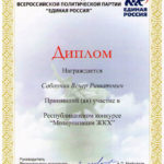 Пройдя процедуру предварительной защиты проекта на тему «Модернизация систем отопления» на базе регионального отделения Партии «Единая Россия» и Российского государственного социального университета Венер стал одним из победителей конкурса, награждён дипломом участника.