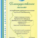 Также в адрес Совета молодых ученых Кумертауского филиала ОГУ направлены Благодарственные письма от Общественной палаты Республики Башкортостан за активную научно-образовательную деятельность во благо Республики Башкортостан и заслуги перед обществом и Регионального движения молодежи Республики Башкортостан за большой вклад в развитие Регионального движения научной молодежи.