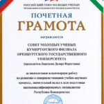 Совет молодых ученых Кумертауского филиала ОГУ награжден Почетной грамотой Регионального отделения Российского союза молодых ученых в Республике Башкортостан за многолетнюю плодотворную работу по развитию и совершенствованию учебно-научного процесса, значительный вклад в дело подготовки высококвалифицированных специалистов Республики Башкортостан. Председатель Совета молодых учёных, к.п.н. Барсукова Д.Ф. – Почетной грамотой Министерства образования Республики Башкортостан за значительные успехи в организации и совершенствовании учебного процесса, повышении педагогической и научной квалификации молодых научно-педагогических кадров, подготовки специалистов высшего профессионального образования.