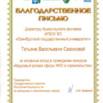 От Кумертауского филиала ОГУ на конкурс было представлено шесть проектов, которые прошли предварительный отборочный тур. Среди представленных работ дипломом II степени удостоена работа студента гр.15Стр(ба) Таратунина Максима и дипломом III степени награждена студентка гр. 16Стр(ба) Кичаева Мария.