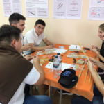 На выполнение задания ушло более четырех часов. Каждая команда выбрала свою тактику: одна, например, сразу же возводила башню под потолок — ребята работали, стоя на стульях, или раскидывала мосты через весь стол; другая собирала только фрагменты конструкций, чтобы соединить их в последний момент.