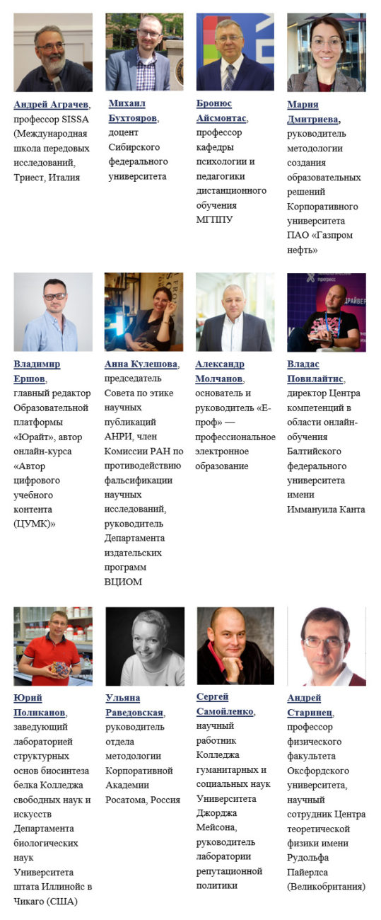 - Анна Кулешова, председатель Совета по этике научных публикаций АНРИ, член Комиссии РАН по противодействию фальсификации научных исследований, руководитель Департамента издательских программ ВЦИОМ;